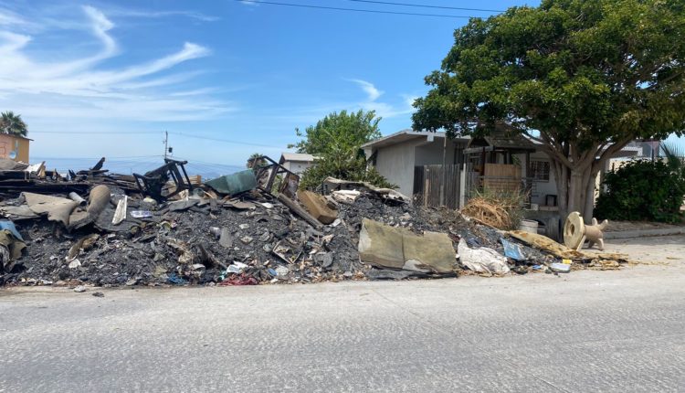 Playas de Rosarito, 22 julio 2022.- Vecinos de la calle Martín Moreno y Mauricio Loaiza de la colonia Lucio Blanco piden que servicios urbanos les ayuden a poder retirar de la vía pública una enorme cantidad de basura a causa de un incendio que ocurrió hace 3 meses.