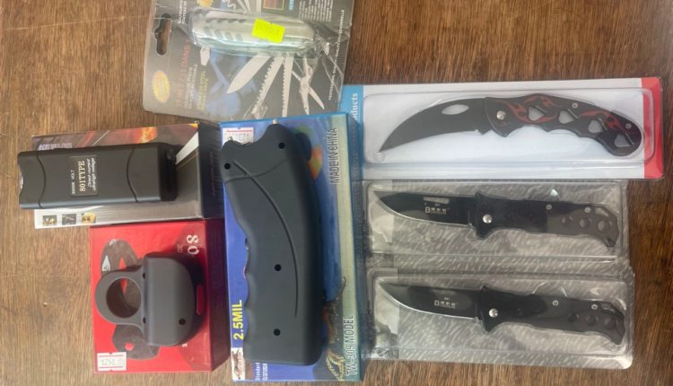 El domingo continuaron los operativos, en el mercado de la calle Guillermo Troncoso en la colonia Lucio Blanco, donde fue detenido el de nombre Ricardo “N”, de 31 años, a quien decomisaron tres navajas de diverso tipo y tres “teaser” de diferentes estilos.