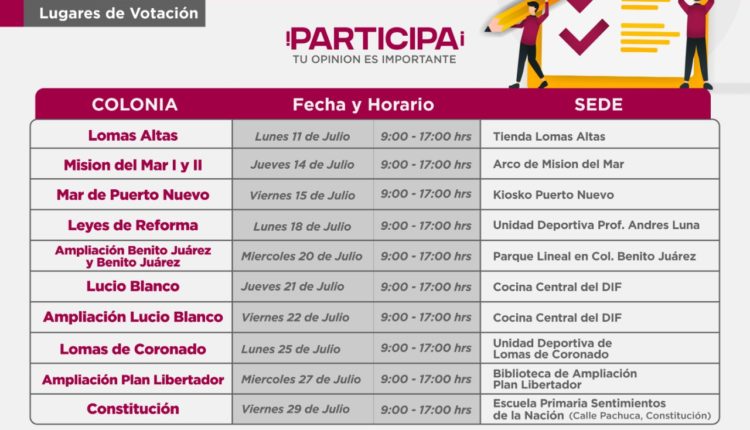Para ello los listados y boletas para votar estarán disponibles en diversas colonias y fechas, hasta el 29 de julio y la calendarización es la siguiente: