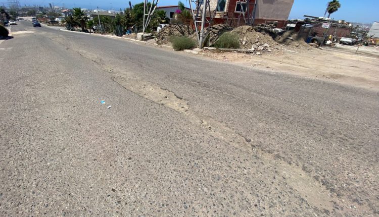 Playas de Rosarito, 1 septiembre 2022.- La calle Alta Tensión de la colonia Lucio Blanco es una de las calles más afectadas con la gran cantidad de baches con la que cuenta, vialidad casi intransitable.