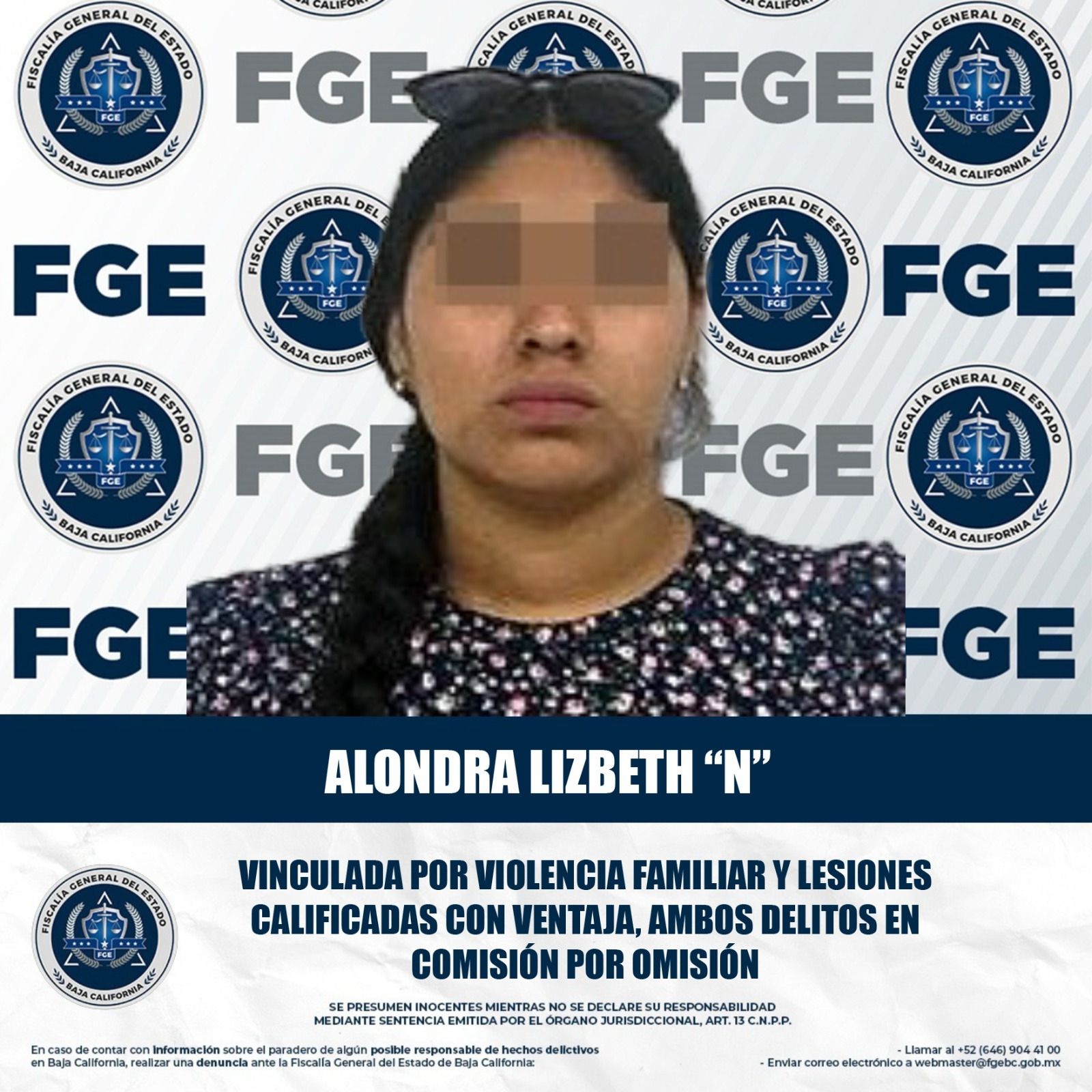 TECATE, BAJA CALIFORNIA, A 25 DE SEPTIEMBRE DE 2025.- La Fiscalía General del Estado (FGE), a través de la Fiscalía Especializada en Delitos contra Mujeres por Razón de Género, obtuvo la vinculación a proceso de Alondra Lizbeth “N”, de 20 años, por los delitos de violencia familiar y lesiones calificadas con ventaja, ambos cometidos por omisión.