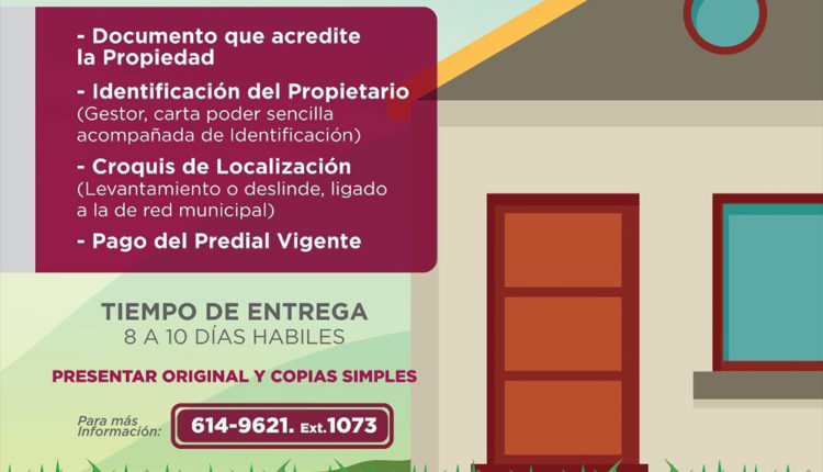 Los requisitos para realizar esta actividad es necesario presentar original y copias del documento que acredite la propiedad, identificación del propietario (si asiste un gestor, llevar carta poder sencilla acompañada de su identificación), croquis de localización (levantamiento o deslinde, ligado a la red municipal) y pago del impuesto predial vigente, documentación que debe ser entregada en un lapso de ocho a diez días hábiles.