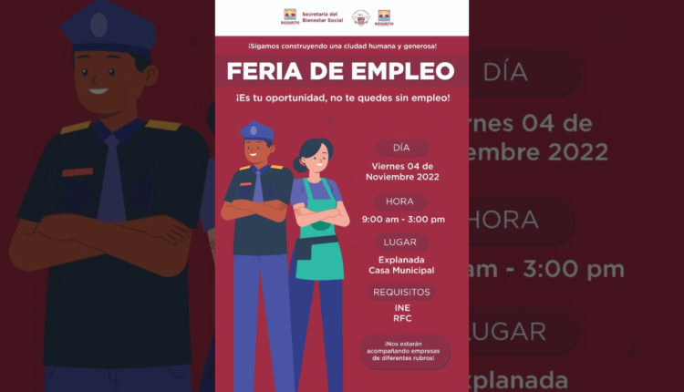 Playas de Rosarito, 3 de noviembre de 2022.- Este viernes se realizará “Feria del Empleo”, que se llevará a cabo este viernes 4 de noviembre a partir de las 09:00 horas, hasta las 3 de la tarde, en la explanada de la Casa Municipal.