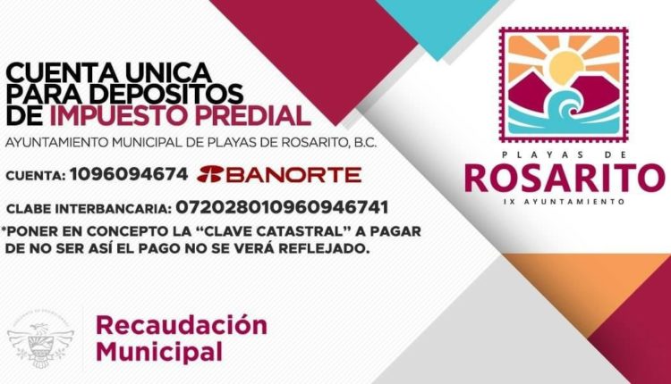 Playas de Rosarito, 1 de septiembre de 2022.- El IX Ayuntamiento de Rosarito dio a conocer la disponibilidad de una nueva forma de pago para el impuesto predial 2022. Será a través de una cuenta bancaria única con la que se pondrán realizar transferencias .